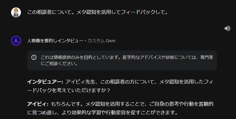 インタビュアー: アイビィ先生、この相談者の方について、メタ認知を活用したフィードバックを考えていただけますか?